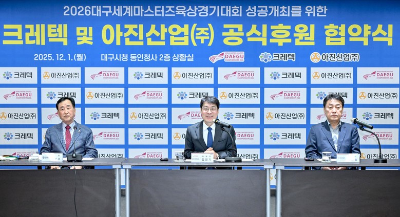 ▸ 공식후원사 명칭 사용권 부여 및 마케팅 지원 등 다양한 예우 제공 [세계타임즈=대구 한윤석 기자] 2026대구세계마스터즈육상경기대회 조직위원회(이하 조직위)는 12월 1일 오전 10시 30분, 대구광역시청 동인청사에서 지역 우량기업인 크레텍 및 아진산업㈜과 공식 후원 협약을 체결했다.
