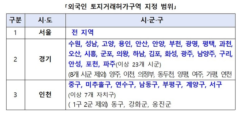 이번 조치로 토허구역 내에서 외국인 개인이나 법인, 정부가 주택을 매수하려면 사전에 소재지를 관할하는 지방자치단체 허가를 받아야 한다. 사전 허가 없는 거래 계약은 무효여서 주택을 취득할 수 없다.다만 유상 거래만 허가 대상이며, 교환, 증여 등 무상 거래에는 적용되지 않는다.외국인 대상 토허구역은 서울의 경우 전 지역, 경기도는 양주시·이천시·의정부시·동두천시·양평군·여주시·가평군·연천군을 제외한 23개 시군, 인천시는 동구·강화군·옹진군을 뺀 7개 자치구다.토허구역 지정 효력은 이달 26일부터 내년 8월25일까지 1년간이다. 정부는 향후 시장 상황을 점검한 뒤 필요하다고 판단되면 기간 연장을 검토할 계획이다.