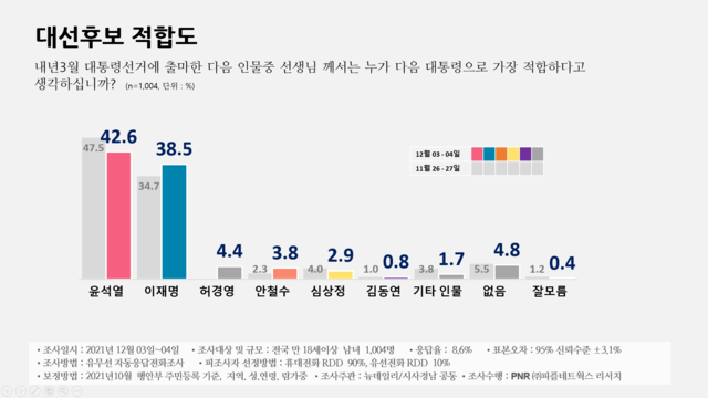 [세계타임즈 이채봉 기자]허경영 국가혁명당 대통령 후보가 12월 5일 여론조사업체 피플네트웍스리서치(PNR)가 실시한 다자구도 대선후보 적합도 조사에서 4.4%를 기록하여 안철수, 심상정 후보를 제쳐 3위를 마크했다.