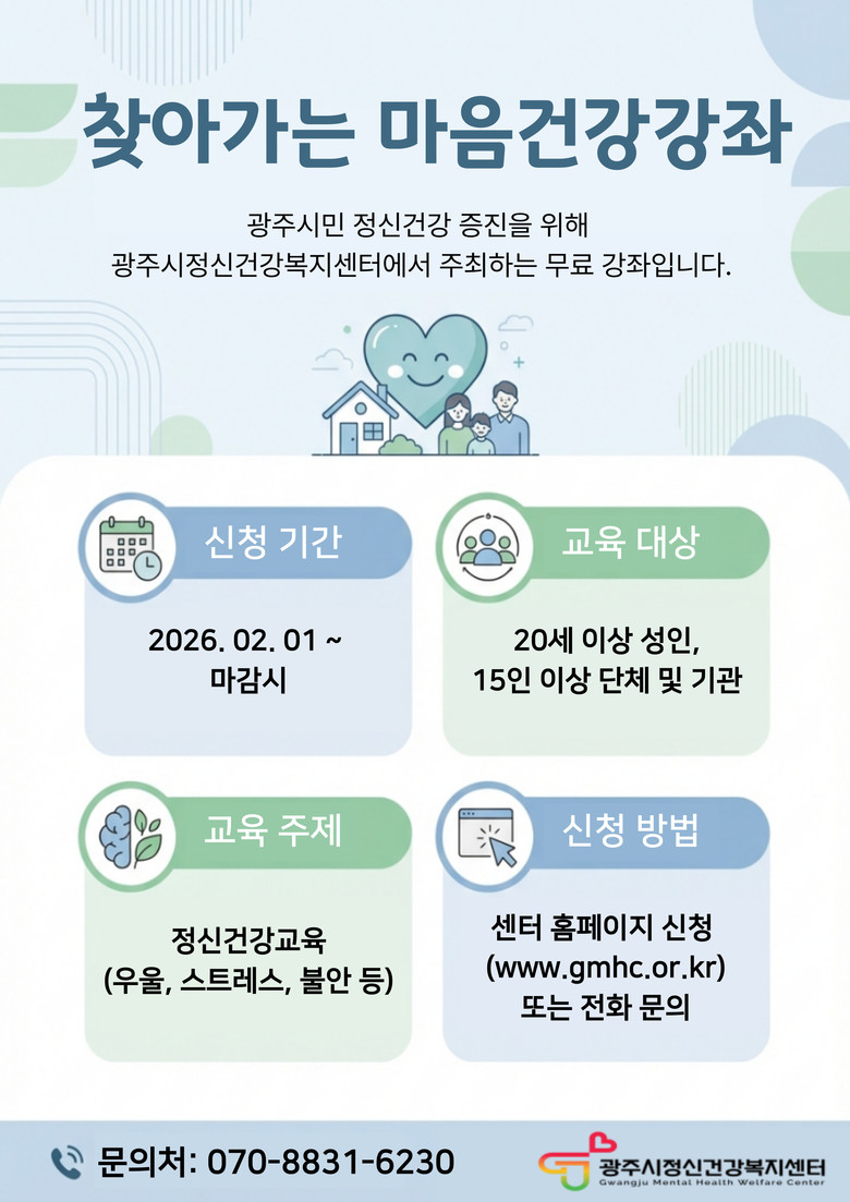 교육은 신청기관과 일정 협의를 거쳐 무료로 제공되며 참여를 희망하는 기관은 광주시정신건강복지센터 또는 센터 누리집을 통해 신청할 수 있다.