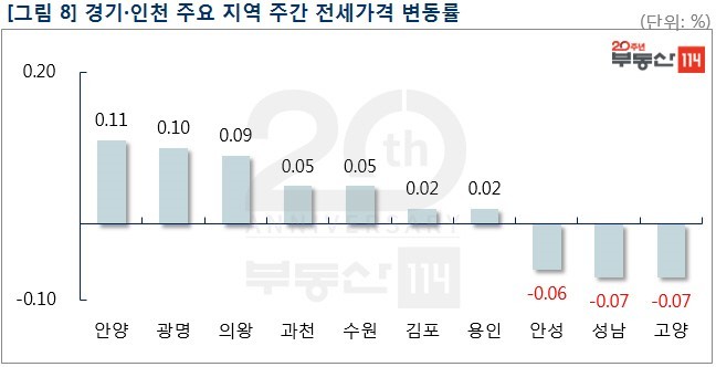 경기ㆍ인천은 △안양(0.11%) △광명(0.10%) △의왕(0.09%) △과천(0.05%) △수원(0.05%) 등이 올랐다. 안양은 대단지 아파트에 전세수요가 늘면서 전셋값이 올랐다. 호계동 호계e편한세상(1,752가구)을 비롯해 안양동 래미안안양메가트리아(4,250가구)가 500만원 상승했다. 광명은 전세 수요가 간간이 이어지면서 철산동 주공12단지와 푸르지오하늘채, 광명동 광명해모로이연 등이 500만원 올랐다. 반면 ▼고양(-0.07%) ▼성남(-0.07%) ▼안성(-0.03%) 등은 떨어졌다.