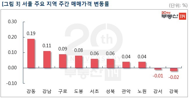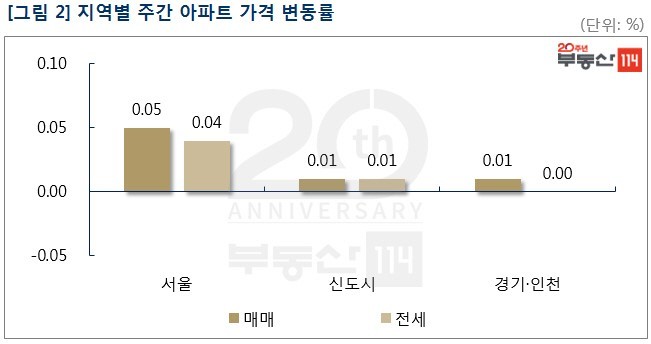 부동산114(www.r114.com)에 따르면 금주 서울 아파트값은 0.05% 올라 지난주(0.02%)보다 상승폭이 커졌다. 재건축은 0.03% 떨어져 2주 연속 하락했고 일반아파트는 0.06% 상승해 오름폭을 키웠다. 이 밖에 신도시와 경기ㆍ인천은 모두 0.01% 올라 강보합세를 나타냈다.