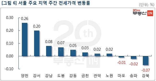 서울 아파트 전셋값은 여름 휴가철이 막바지에 접어든데다 가을 이사 수요가 유입되면서 상승폭이 확대됐다. 지역별로는 △양천(0.26%) △강서(0.20%) △강남(0.08%) △도봉(0.07%) △강동(0.05%) 등이 올랐다. 양천은 본격적인 가을 이사철을 앞두고 전세 물건 부족으로 올랐다. 목동 한신청구(1단지)를 비롯해 목동신시가지6단지·3단지가 등이 1,000만원-4,000만원 상승했다. 강서는 마곡동 마곡13단지힐스테이트마스터가 1,000만원-4,500만원 상승했고 염창동 동아1차와 화곡동 우장산IPARK,e편한세상은 500만원 가량 올랐다. 반면 아직까지 전세수요가 뜸한 ▼강북(-0.07%)을 비롯해 ▼송파(-0.02%) ▼마포(-0.01%)는 하락했다.