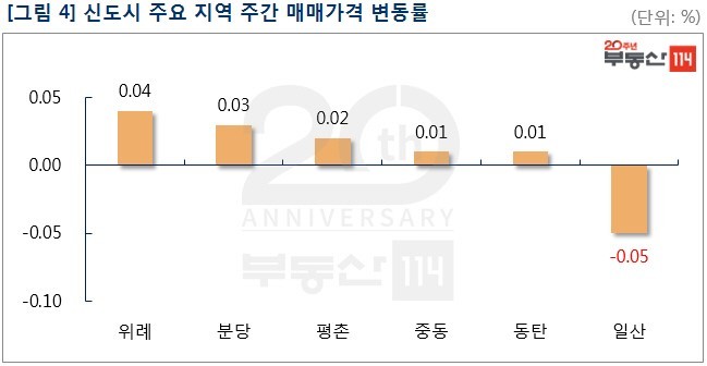 신도시는 △위례(0.04%) △분당(0.03%) △평촌(0.02%) △중동(0.01%) 등이 올랐고 ▼일산(-0.05%)은 하락했다. 위례는 강남권 일반아파트 가격 상승 영향으로 성남시 창곡동 위례자연앤센트럴자이가 500만원 올랐다. 분당은 야탑동 장미코오롱을 비롯해 정자동 한솔주공4단지와 수내동 양지1단지금호 등이 500만원-1,000만원 상승했다. 반면 일산은 매수세가 뜸한 가운데 킨텍스 원시티 입주 영향으로 떨어졌다.