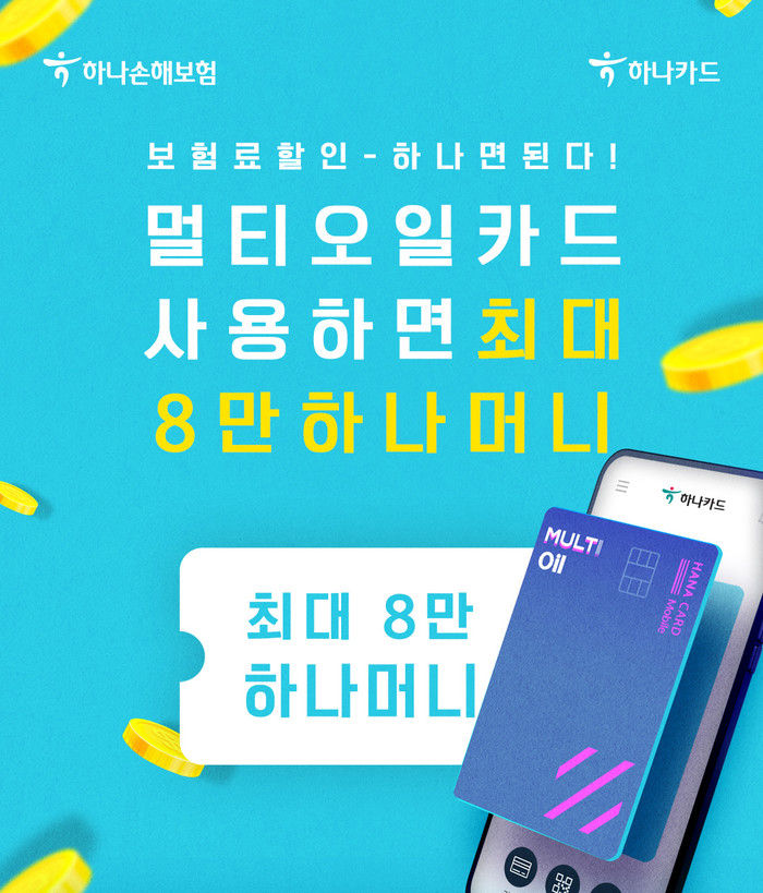 멀티오일카드로 하나손해보험의 자동차보험료를 30만 원 이상 결제 시 3만 하나머니를 적립받을 수 있고, 이전 6개월간 하나 신용카드 결제 이력이 없는 고객은 자동차보험료 외에 온/오프라인 전가맹점에서 10만 원 이상 결제 시 5만 하나머니를 추가로 제공한다.
