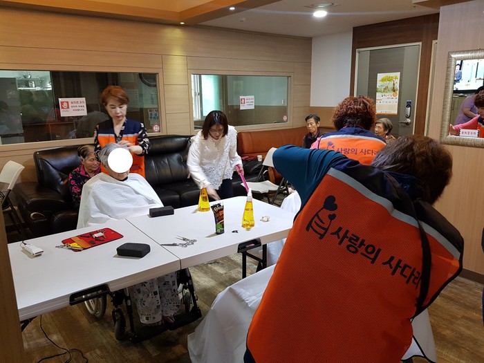 김숙희 원장은 “ 사랑의 사다리 밴드 미용봉사가 거동을 못하시는 어르신들께 큰 힘이 되고 있다.“면서 감사함을 전했다.