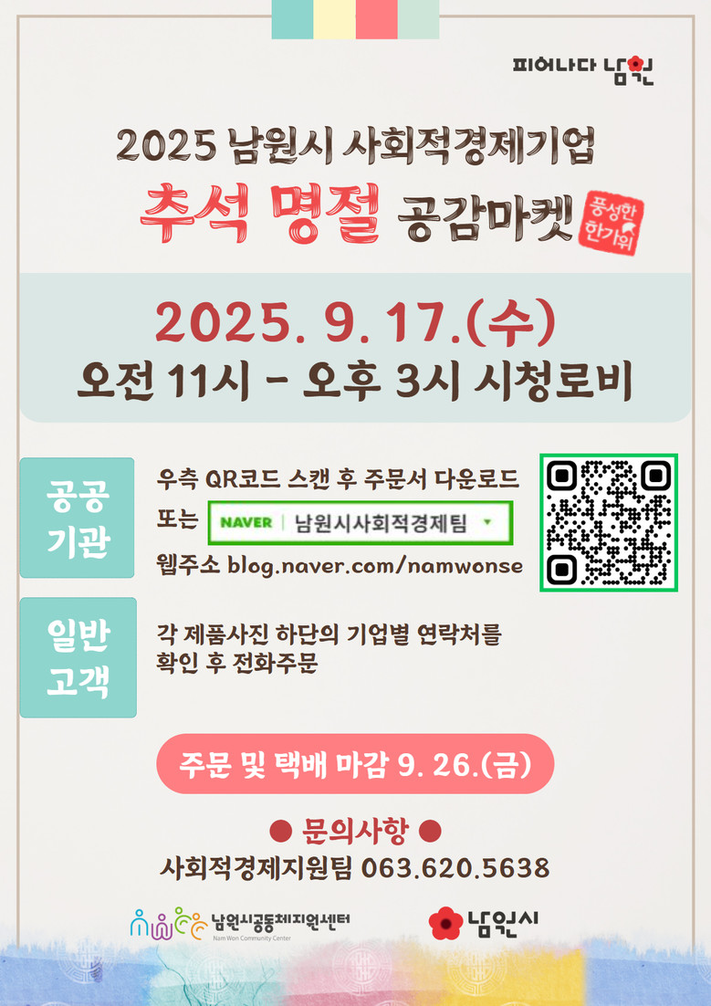 최경식 남원시장은 “추석을 앞두고 지역민이 직접 생산한 우수한 사회적경제 제품을 보다 합리적인 가격에 구매할 수 있는 좋은 기회가 될 것”이라며, “지역순환경제에 이바지하는 사회적경제기업이 뿌리내릴 수 있도록 지속적인 지원을 아끼지 않을 것”이라고 밝혔다.