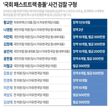 당시 여야는 고위공직자범죄수사처 신설 법안과 연동형 비례대표제 도입 법안 등을 패스트트랙(신속처리 안건) 법안으로 지정할지를 놓고 극한 대립을 벌이다가 물리적으로 충돌했다.검찰은 나 의원에게 징역 2년, 황 전 총리에게 징역 1년 6개월을 구형한 상태다.국민의힘 원내대표인 송언석 의원에게는 징역 10개월과 벌금 200만원, 이만희·김정재 의원에게는 징역 10개월과 벌금 300만원, 윤한홍 의원에게는 징역 6개월과 벌금 300만원, 이철규 의원에게는 벌금 300만원을 구형했다.