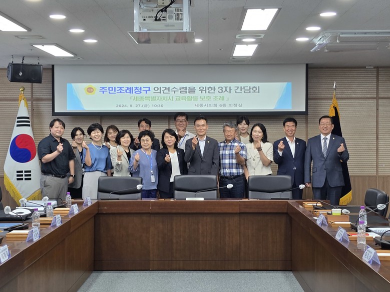 [세종 세계타임즈=이채봉 기자] 세종특별자치시의회(의장 임채성) 교육안전위원회(위원장 윤지성)는 주민조례 제정 청구를 통해 발의된 「세종특별자치시 교육활동 보호 조례」의 의견수렴을 위해 청구인, 관계 기관과의 3자 간담회를 27일 실시했다.