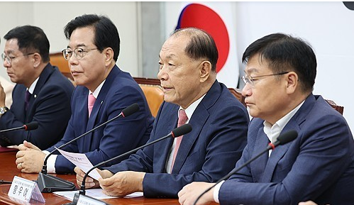 국민의힘 황우여 선거관리위원회 위원장(왼쪽 세번째)이 14일 국회에서 열린 당 대표 및 최고위원 선출 선거관리위원회 위촉장 수여식에서 발언하고 있다. 2025.7.14 [국민의힘 제공]