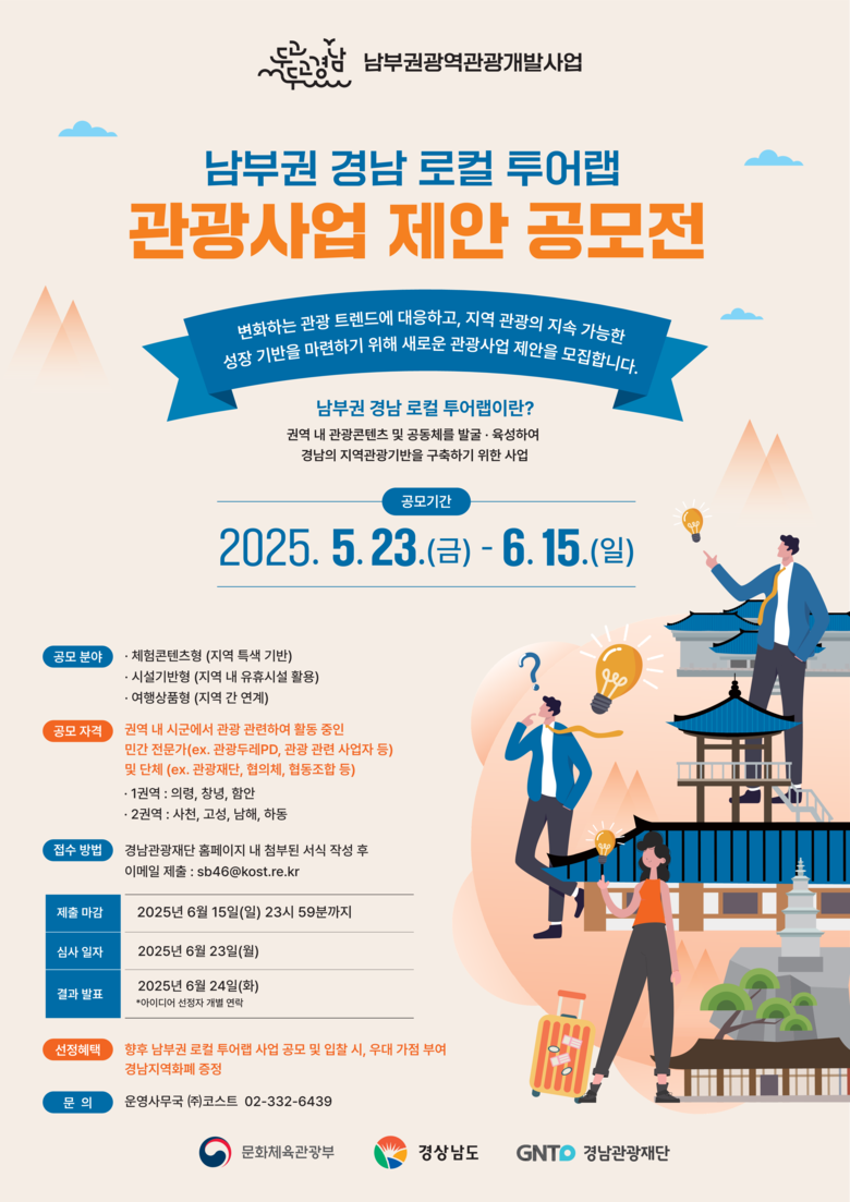 공모전 참여를 원하는 지역 중간조직은 오는 6월 15일까지 경남관광재단 홈페이지에서 신청 양식을 다운로드하여 작성한 뒤 이메일(sb46@kost.re.kr)로 제출하면 된다.