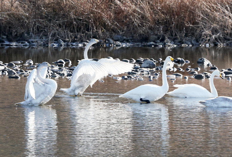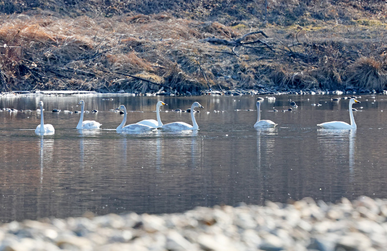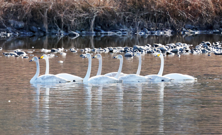 21일 오전 괴산군 달천강 이탄교 인근에서는 성조와 어린 새를 포함한 일곱 마리의 큰고니 무리가 한꺼번에 관찰돼 지역 주민과 탐조가들의 눈길을 사로잡고 있다.