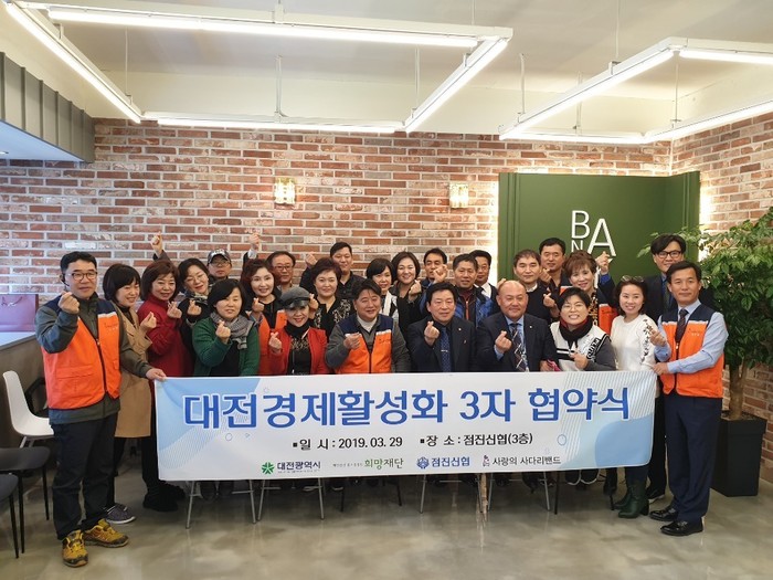 [세계타임즈 이장성 기자] SNS 대전시 봉사단체 (사)사랑의 사다리 밴드는 29일 오전11시 점진신협 3층에서 대전소상공인 살려 이웃사랑을 함께 실천하기 위해서 점진신협(이사장 신현학), (재)중소상공인희망재단(이사장 이윤재)과 대전경제활성화를 위한 3자 업무협약(MOU)을 체결했다.
