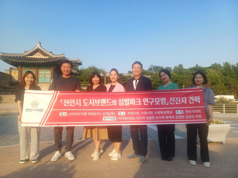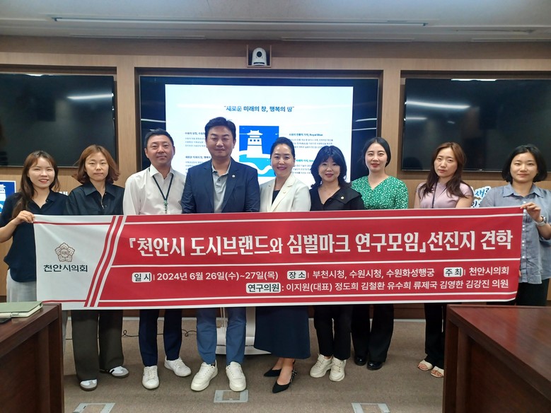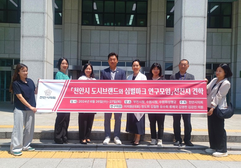 [천안시 세계타임즈=백택기 기자] 천안시의회 「천안시 도시브랜드와 심벌마크 연구모임」(대표의원 이지원)이 국내 심벌마크 교체 우수사례를 연구하기 위해 26일~27일 부천시, 수원시를 방문했다. 이번 견학에는 연구모임 소속의원, 천안시 정책기획과장, 정책연구원 등이 참석했다.