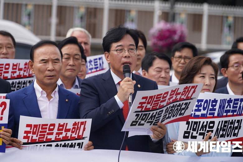 '송언석' 당대표 권한대행 겸 원내대표가 1일 오전 서울 용산구 대통령실 앞에서 열린 현장 의원총회에서 발언하고 있다.세계타임즈 / 신상철 기자 news@thesegye.com