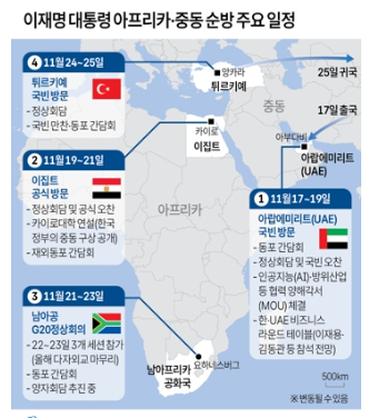 특히 한미 관세·안보 협상을 일단락 지은 뒤 중동과 아프리카 지역으로 외교를 다변화한다는 데 이번 순방의 의미가 있다. 남아공에서 열리는 G20 정상회의의 경우 사실상 올해 이 대통령의 마지막 다자외교 무대가 될 것으로 보인다.우선 이 대통령은 첫 방문국인 UAE에서 무함마드 빈 자이드 알나하얀 대통령과 회담을 갖고 양국 간 인공지능(AI)·방위산업 등 협력을 위한 양해각서(MOU)를 체결한다.양국의 경제인 간 협력을 촉진하기 위해 마련된 비즈니스 라운드테이블 행사에도 참석할 계획이다.