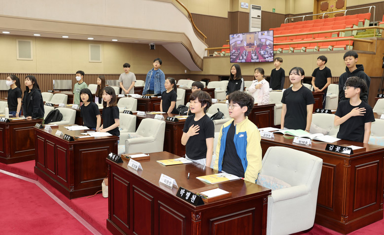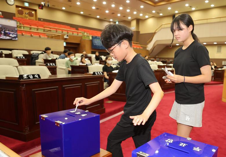 율량초교 학생들은 무기명 투표를 통해 청소년 의장을 선출하고 ‘하교 이후 학교 운동장 사용 금지 조례안’과 ‘식생활관 이쑤시개 비치 건의안’, ‘각 학급에 옷걸이 비치 건의안’ 등 안건 3건을 심의‧의결했다.