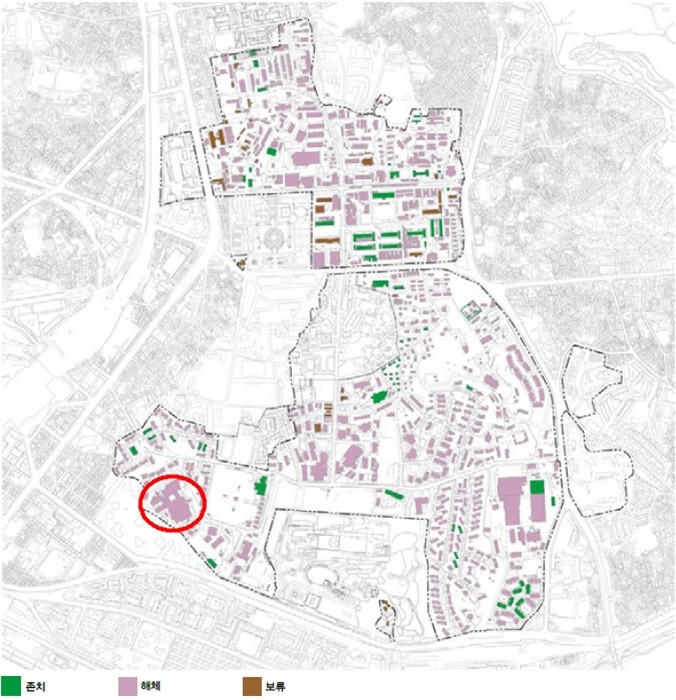 ▲ 용산공원 국제공모 당선 조성계획안 중 해체대상 건축물(원 안이 121병원)