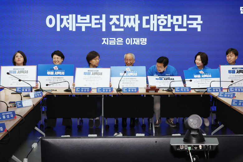 더불어민주당 윤여준·박찬대 상임 총괄선대위원장과 공동선대위원장인 야권 정당 대표들이 사전투표를 하루 앞둔 28일 서울 여의도 당사에서 열린 중앙선거대책위원회의에서 투표서약서에 서명 후 투표를 독려하고 있다.