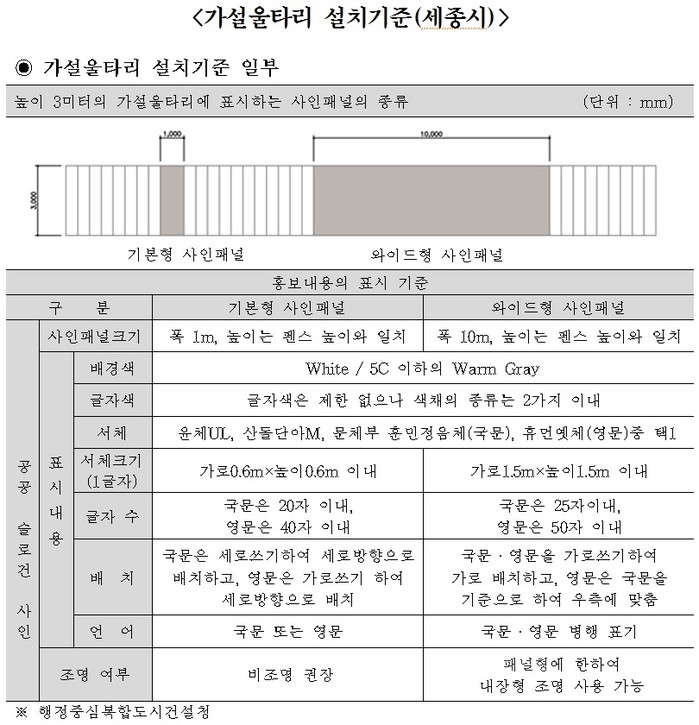 그러나 타 시도의 경우, 세종시는 가설울타리의 높이와 재질, 색채 등 세세한 부분까지 기준을 정하여 시행하고 있고, 안양시도 높이와 재질 그리고 기본디자인을 적용하여 안양시 BI와 상징물, 안양 옛 모습 등을 소재로 공공성, 지역성, 예술성이 가미된 내용을 담아 주변 환경과 아름다운 조화를 이루도록 하고 있다.