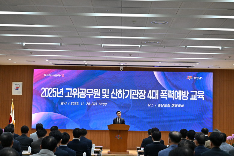 건강한 공직문화를 정착시키고 폭력을 근본적으로 예방하기 위한 이번 교육에는 김태흠 지사와 실·국·본부장 등 고위직 공무원, 산하 기관장 등 60여 명이 참석했다.