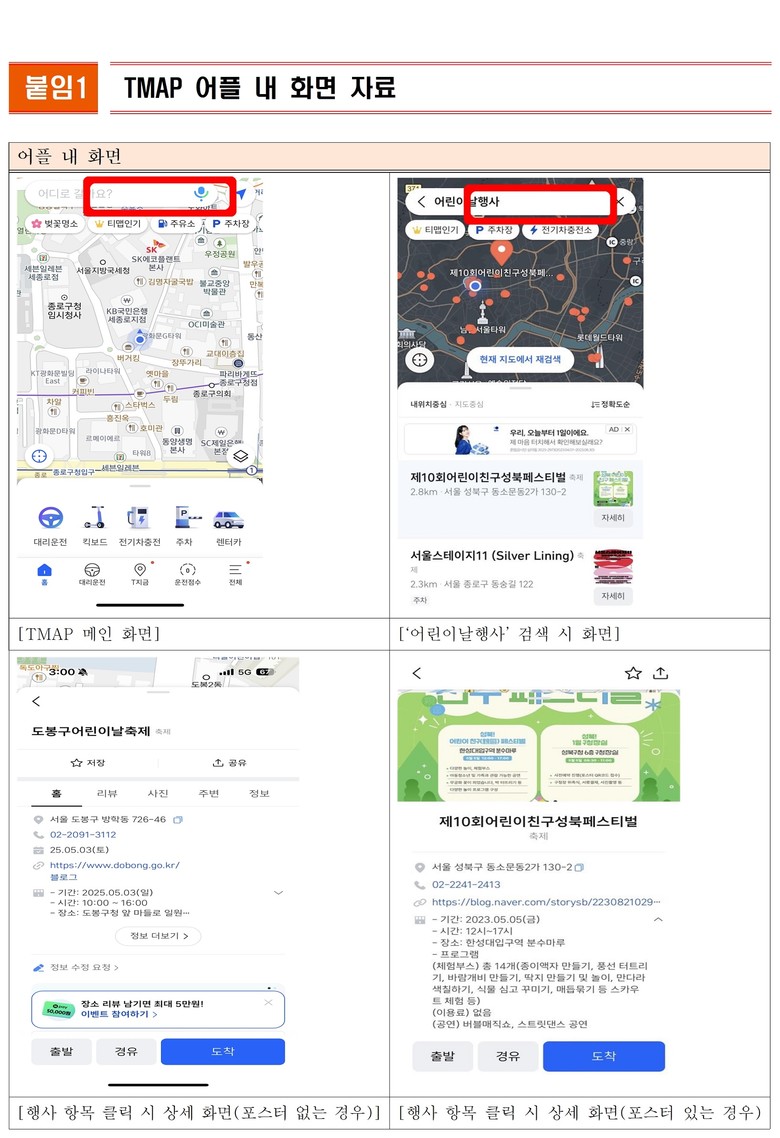 보다 상세한 지역별 어린이날 행사 정보는 티맵(TMAP) 애플리케이션을 통해 확인할 수 있으며, TMAP 앱 내 화면에서 ‘어린이날 행사’를 검색하면 내위치 또는 지도 중심으로 어린이날 행사 정보를 볼 수 있다.