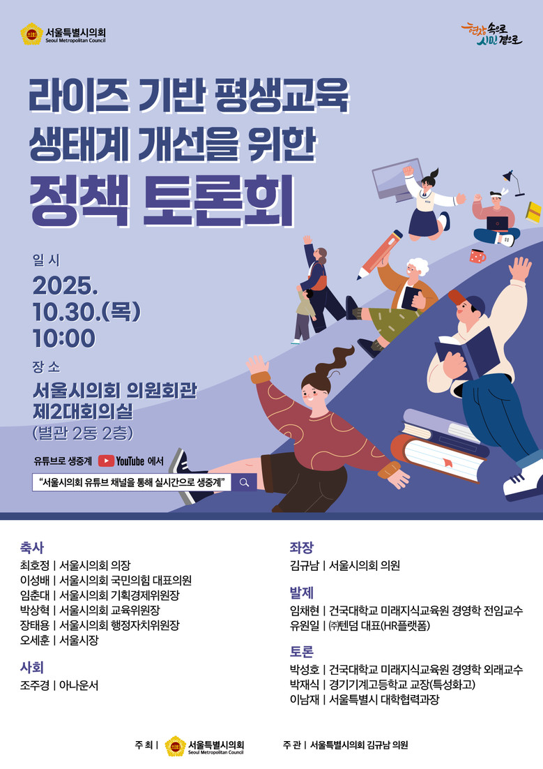 행사는 서울시의회가 주최하며, 서울시 관내 특성화고 관계자, 학점은행제 대학, 청년창업가, 관련 부서 공무원 등 100여 명이 참석할 예정이다. 좌장은 김규남 서울시의회 의원이 맡으며, 향후 ‘서울특별시 라이즈(RISE) 추진 및 운영 조례’ 제정을 통해 서울형 라이즈 제도화를 추진할 계획이다.