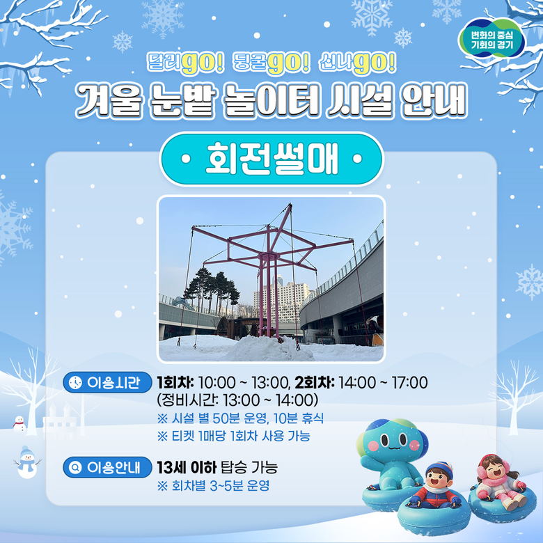 경기도담뜰에 문을 연 놀이 시설은 눈썰매, 얼음 썰매, 회전 썰매를 비롯해 컬링장과 에어바운스, 미니 바이킹 등 체험 공간으로 구성된다. 안전을 위해 키 120cm 미만 아동의 경우 보호자를 동반해야만 눈썰매장을 이용할 수 있고, 회전 썰매와 미니 바이킹은 13세 이하만 탑승 가능하다.