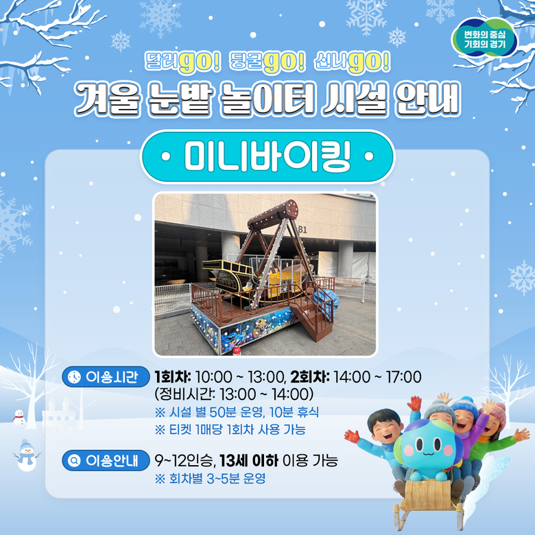 경기도는 겨울방학을 맞은 아이들과 가족이 도심 속에서 안전하게 겨울 놀이를 즐길 수 있도록 ‘겨울 눈밭 놀이터’를 운영하게 됐다고 취지를 설명했다.