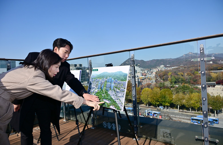 | ▲ 세운상가 옥상에서 세운4지역 개발계획 확인하는 최호정 의장 |