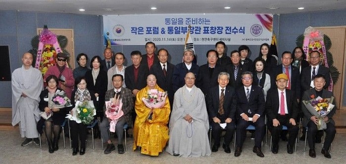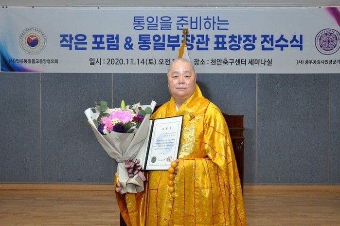 사단법인 대한불교전국비구니진흥회 총재 겸 대한불교연화조계종 종정 일경 큰스님이 지난 14일 천안축구센터 세미나실에서 열린 '통일을 준비하는 작은 포럼 및 통일부 장관 표창장 전수식'에서 통일부장관 표창을 받았다.