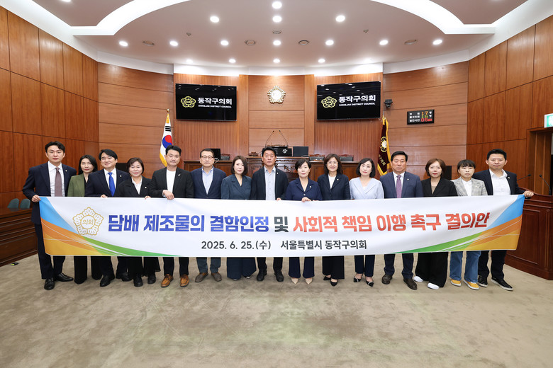 마지막으로 김효숙 의원이 대표발의한 「담배 제조물의 결함 인정 및 사회적 책임 이행 촉구 결의안」을 채택했다. 결의안은 담배 제조사의 유해성 은폐와 책임 회피를 지적하며 제조물 결함 인정을 촉구하고, 국민 건강 보호와 금연 환경 조성을 위한 실효성 있는 제도 마련에 국가와 지자체의 적극적인 역할을 강조하며 정부의 금연 정책 강화를 요구하는 내용을 담고 있다.