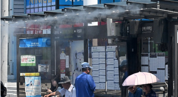 불볕더위에 가동되는 버스 승강장 쿨링포그