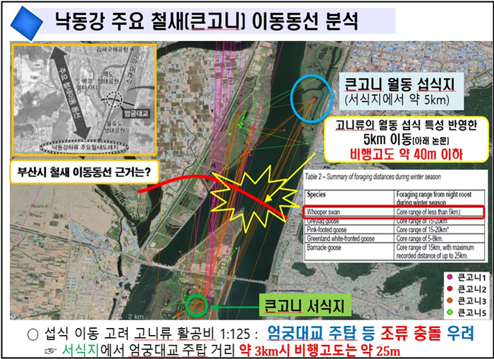 특히, 2019년 장락대교 조류영향조사와 2021년 환경부 산하 국립생물자원관으로부터 받은 큰고니 이동경로 자료에 따르면 고니의 섭식을 위한 이동경로가 엄궁대교를 넘어가는 동선인데도 엄궁대교 주탑높이에 대해 실시설계적격자가 조류 자문의견서을 받아온 내용 어디에도 없었다.
