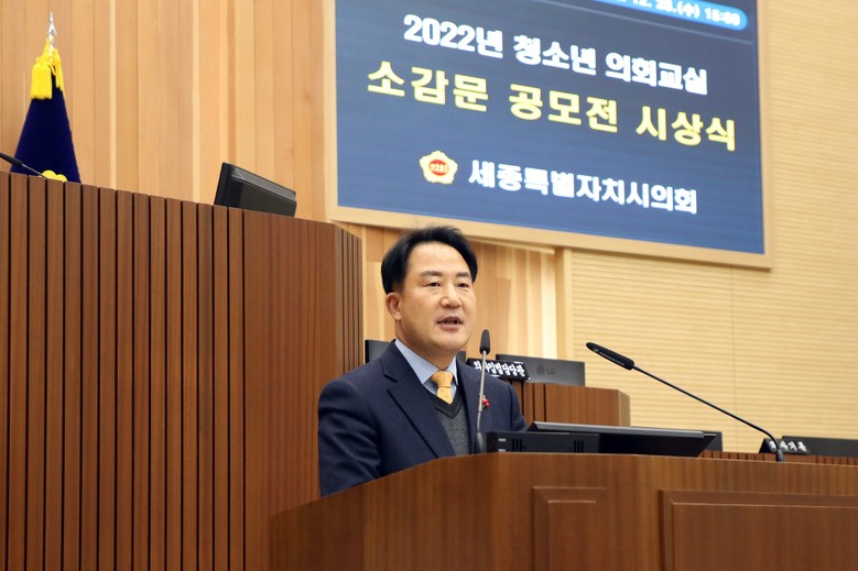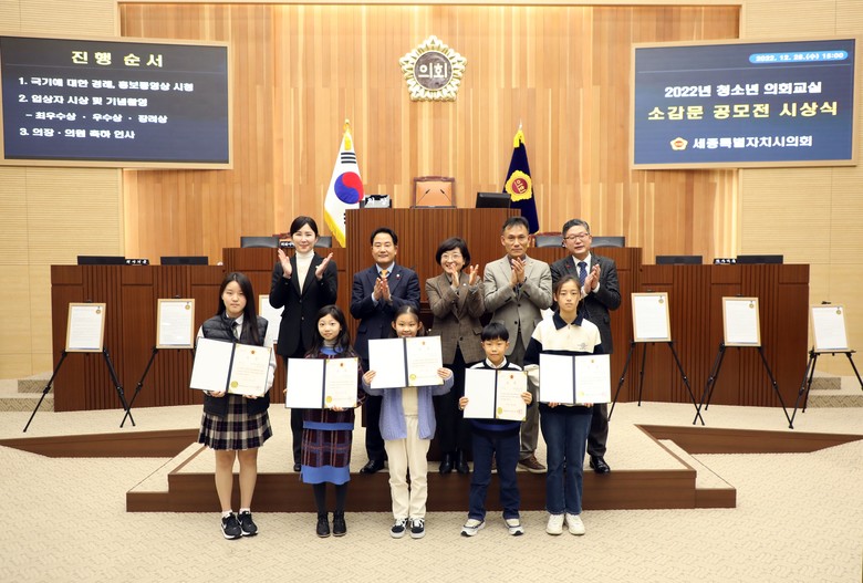 [세종 세계타임즈=이채봉 기자] 세종특별자치시의회(의장 상병헌)는 28일 본회의장에서 ‘2022년 청소년 의회교실 소감문 공모전’ 시상식을 개최하고 우수작으로 뽑힌 7명에게 상장을 수여했다.