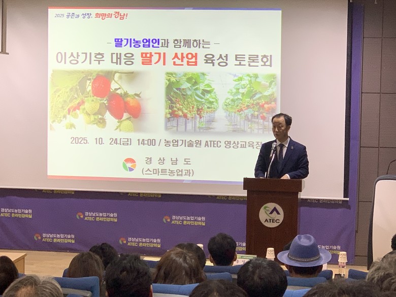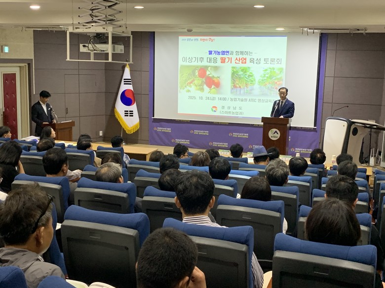– 도, 농업기술원 등 5개 분야 정책현안 및 주제 발표 등 정보 공유 [세계타임즈=경남 최성룡 기자] 경상남도(도지사 박완수)는 24일 도 농업기술원 ATEC 영상교육장에서 ‘이상기후 대응 딸기 산업 육성 토론회’ 를 개최하고, 지구 온난화로 인한 폭염, 극한호우 등 이상기후에 대응하기 위한 딸기 산업의 지속 가능 방안에 대해 논의했다고 밝혔다.