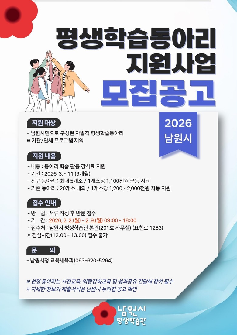 신청 접수는 2월 2일부터 2월 9일까지 남원시평생학습관에서 방문 접수로 진행되며, 서류 및 현장 실사 과정을 거쳐 오는 2월 20일 최종 선정 결과를 발표할 예정이다.