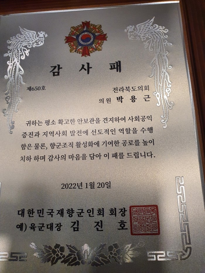 이날 전달식에서 대한민국재향군인회 측은 “평소 박용근 의원은 확고한 안보관을 견지하여 사회공익 증진과 지역사회 발전에 선도적인 역할을 수행했고, 특히 향군조직 활성화에 기여한 공로를 인정해 감사패를 전달하게 됐다”고 밝혔다.