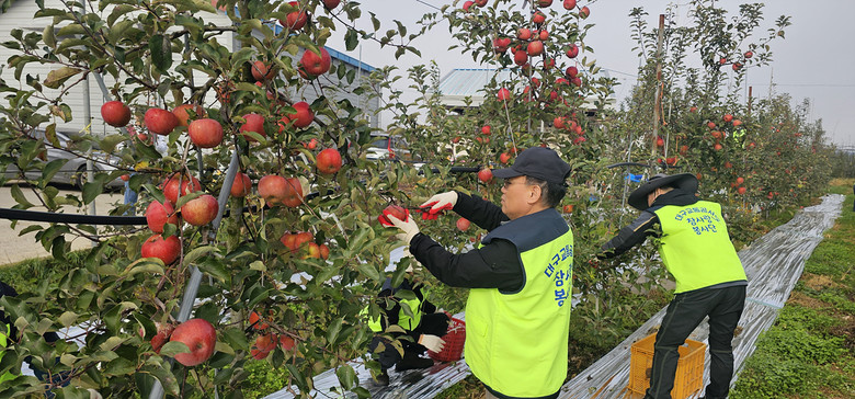 이날 봉사에는 공사 직원들로 구성된 참사랑봉사단 50여 명이 참여해 사과 수확과 선별, 과수원내 잡초 제거 및 폐비닐 수거 등 다양한 작업을 도우며 일손 부족으로 어려움을 겪는 농가에 힘을 보탰다.