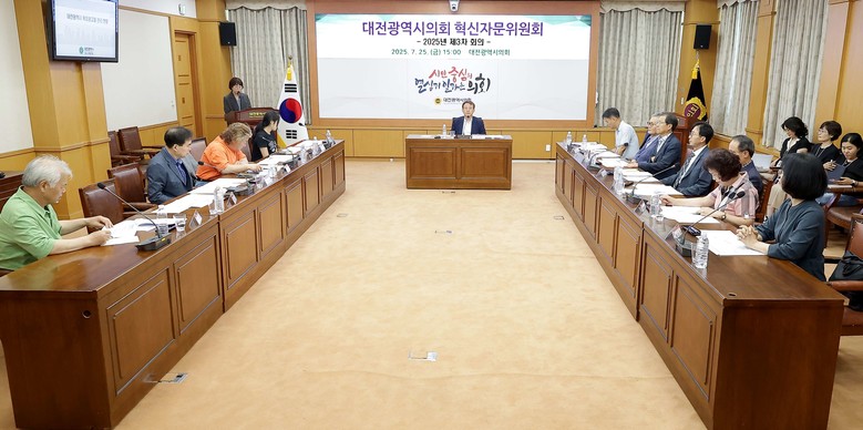 [대전 세계타임즈=이채봉 기자] 조원휘 대전시의회 의장 직속 자문기구인 대전시의회 혁신자문위원회의 2025년 제3차 회의가 25일 오후 3시 시의회 소통실에서 열렸다. 이날 회의는 ‘품격있는 도시 대전을 위한 도시미관 관리 혁신 방안’을 안건으로 정교순 위원장을 비롯한 12명의 자문위원이 참석해 대전의 도시 이미지 향상을 위한 시의회의 역할에 대해 다양하고 심도있는 의견을 개진했다.