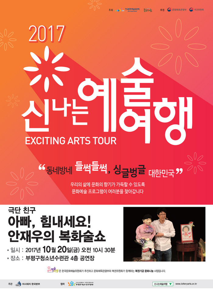 이날 상연될 ‘아빠, 힘내세요!-안재우의 복화술쇼’는 국내 최초로 시도된 소리 예술로, 복화술 공연이다. 소리예술분야의 새로운 지평을 여는 이 작품을 통해 부평관내 청소년이 새로운 문화적 행복을 느끼고 문화예술분야의 진로를 탐색해보는 시간이 될 것으로 기대된다.