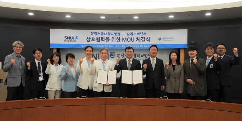 | ▲ MOU 체결 이후 분당서울대병원과 E-순환거버넌스 관계자들이 기념사진을 촬영하고 있다.(사진=분당서울대병원) |