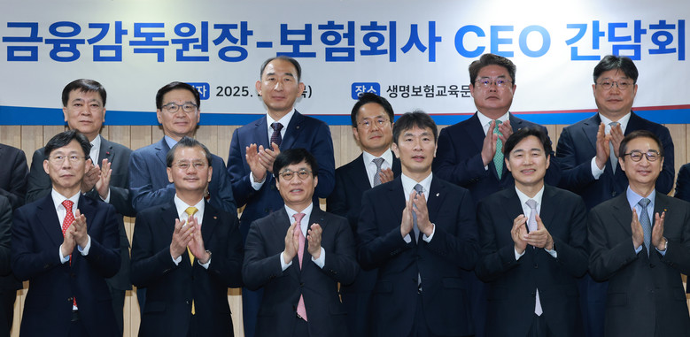 이복현 금융감독원장이 27일 서울 종로구 생명보험교육문화센터에서 열린 보험회사 최고경영자(CEO) 간담회에 참석해 기념 촬영하고 있다. 2025.2.27