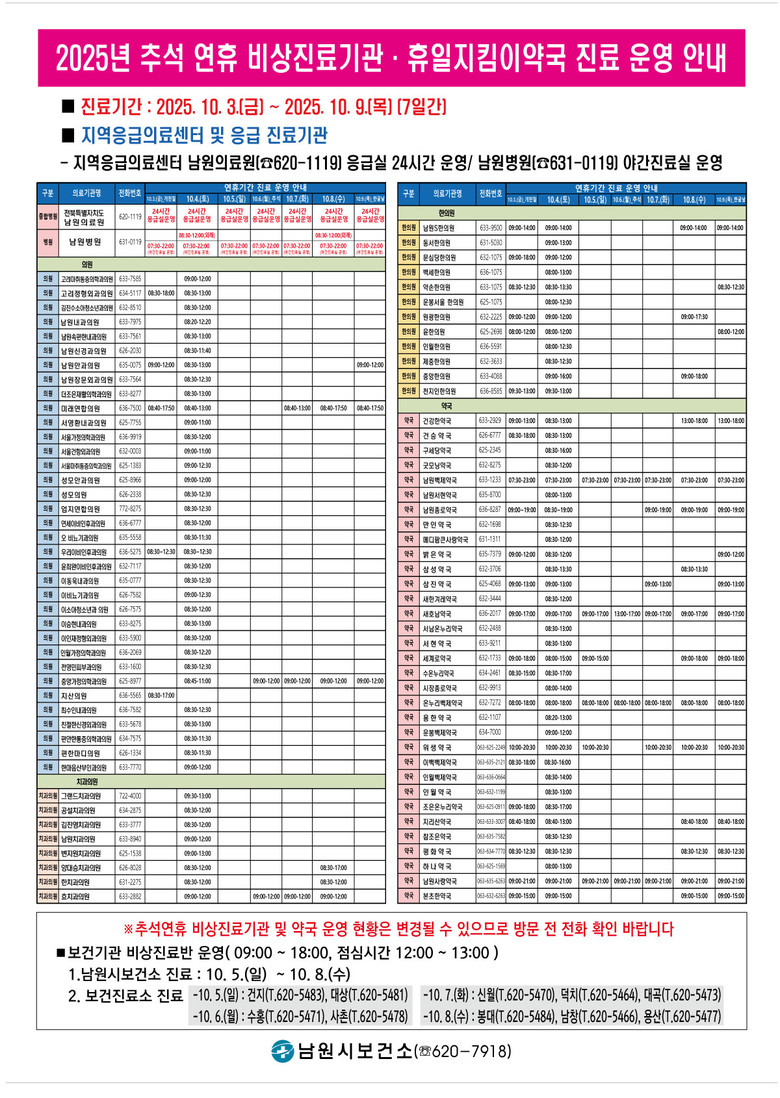 보건기관 및 병·의원, 약국 101개소를 비상진료기관 및 휴일지킴이약국으로 지정했으며, 관내 지역응급의료센터인 남원의료원은(620-1114) 평소와 동일하게 24시간 응급실을 운영한다. 남원병원은 7시 30분에서 22시까지 야간 진료실을 운영하고, 보건소는 5일(일)부터 8일(수)까지 진료실을 운영할 예정이다.