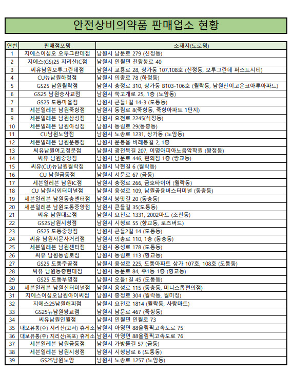 아울러 연휴 기간 동안 의료기관 및 약국 방문이 어렵거나 가벼운 증상일 경우 안전상비의약품 판매업소로 지정된 24시간 운영 편의점(39개소)에서 해열진통제, 소화제, 감기약 등 안전상비의약품을 구입할 수 있다.
