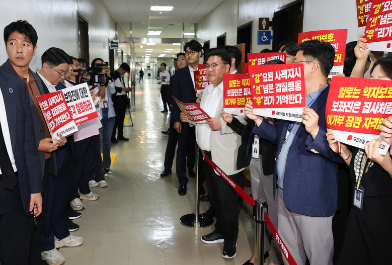 속개 이후에도 여야는 피켓을 둘러싸고 입씨름을 벌였다.국민의힘 의원들이 노트북에 부착한 피켓을 떼지 않자 여당 의원들은 항의하며 '내란정당 아웃 발목잡기 스톱' 등 문구를 노트북 앞에 붙이며 맞대응했다.여야는 피켓을 두고 30여분간 설전을 벌이다 위원장의 중재 하에 양측 모두 피켓을 떼면서 청문회가 가까스로 시작했다.국민의힘은 초반부터 강 후보자의 '보좌진 갑질 논란'을 직격했다.이달희 의원은 "갑질 장관은 여가부 장관이 될 수 없다"며 "사적인 용무나 심부름을 자기 직원에게 시키는 일은 명백한 직장 내 괴롭힘, 불법"이라고 추궁했다.