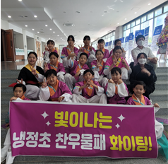 냉정초등학교 차옥화 교장은 “우리 전통문화에 관심을 가지고 열심히 활동하고 있는 찬우물패 학생들이 고맙고 자랑스럽다. 우수상 수상을 축하한다”고 칭찬하였으며, 열과 성을 다하여 찬우물패 학생을 지도해 주시는 선생님에게도 감사의 마음을 전했다.