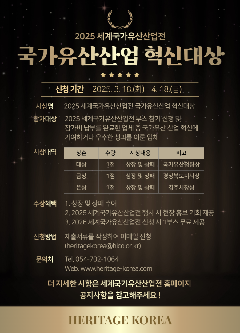 혁신대상 참가 신청은 4월 18일까지이며, 국가유산 관련 기업·기관 누구나 응모할 수 있다. 자세한 내용은 세계국가유산산업전 공식 홈페이지에서 확인 가능하다.