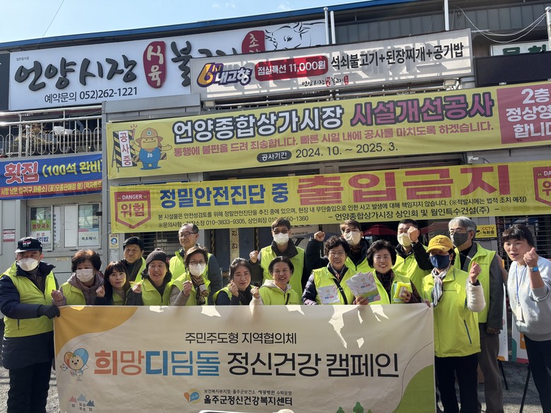 [울주군 세계타임즈=이호근 기자] 울주군정신건강복지센터 주민주도형 정신건강지원단 ‘희망디딤돌’이 7일 언양 알프스시장에서 정신건강 인식개선 캠페인을 진행했다.