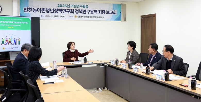 [인천 세계타임즈=심하린 기자] 인천광역시의회 의원연구단체 ‘인천 농어촌 청년정책 연구회(대표의원 신영희)’가 19일 행정안전위원회 세미나실에서 정책연구용역 최종보고회를 열고, 농어촌·도서 지역의 인구 감소 대응을 위한 평생교육·사회적경제 기반 청년 정착 모델을 발표했다.